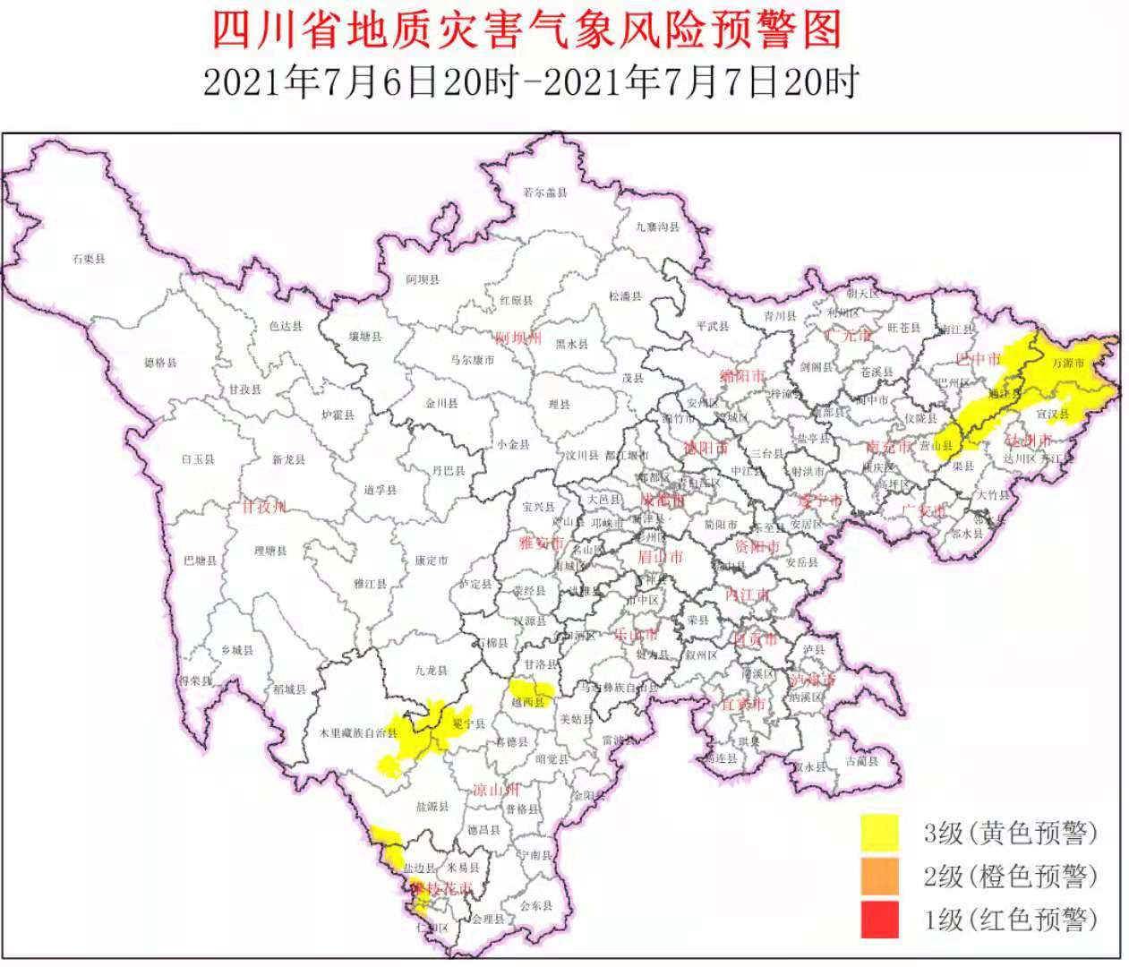 四川省地质灾害指挥部办公室今天17时发布消息,7月6日20时—7月7日20时,全省地质灾害气象风险3级黄色预警区域为巴中通江县、平昌县,达州达川区、万源市、宣汉县、渠县,南充营山县、仪陇县,攀枝花西区、仁和区、盐边县,甘孜州九龙县,凉山州西昌市、木里县、盐源县、冕宁县、越西县、甘洛县。