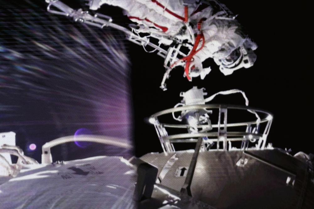 7月4日,在北京航天飞行控制中心大屏拍摄的航天员在舱外工作场面。(新华社记者金立旺摄)