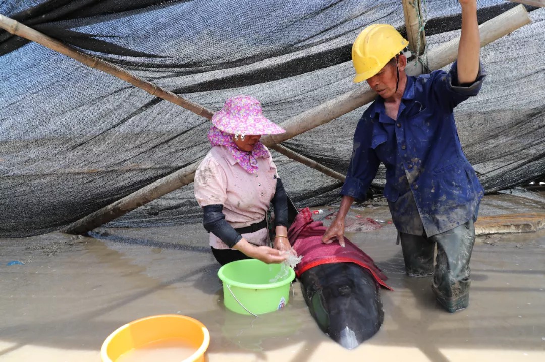 大家不断往瓜头鲸身上浇水
