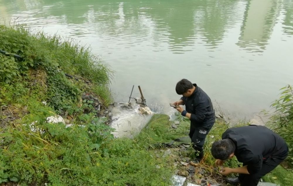 铜仁市南长城国际大酒店污水溢流直排锦江,图为督察组工作人员正在取证。(贵州省生态环境厅供图)