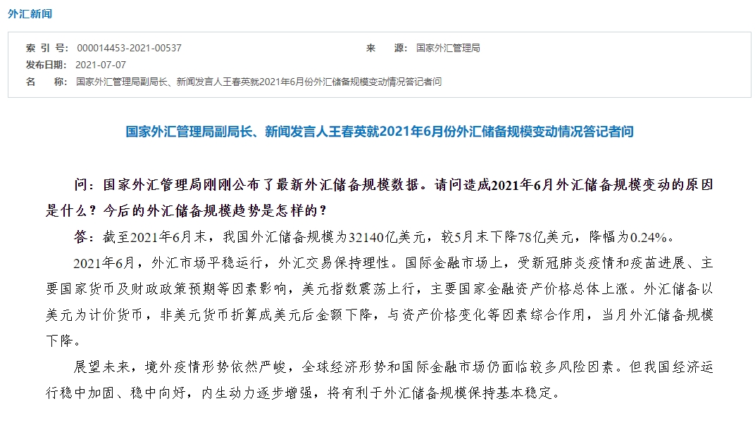 央视网消息:据国家外汇局网站消息,针对2021年6月份外汇储备规模变动情况,国家外汇局管理局副局长、新闻发言人王春英指出,截至2021年6月末,我国外汇储备规模为32140亿美元,较5月末下降78亿美元,降幅为0.24%。