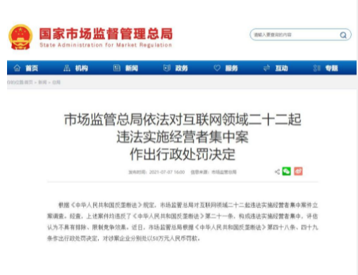 根据《中华人民共和国反垄断法》规定,市场监管总局对互联网领域二十二起违法实施经营者集中案件立案调查。经查,上述案件均违反了《中华人民共和国反垄断法》第二十一条,构成违法实施经营者集中,评估认为不具有排除、限制竞争效果。近日,市场监管总局根据《中华人民共和国反垄断法》第四十八条、四十九条作出行政处罚决定,对涉案企业分别处以50万元人民币罚款。详情>>>