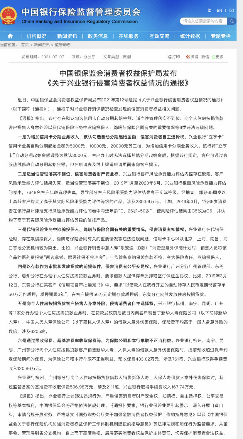 通报指出,兴业银行上述违法违规行为,严重侵害消费者财产安全权、知情权、自主选择权、公平交易权等基本权利,银保监会将严格依法依规处理。