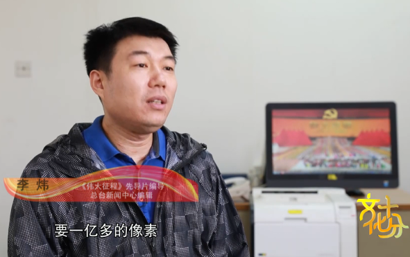 《伟大征程》先导片编导 李炜:高清画面是16:9的,更老的素材是4:3的,这么长的屏幕,很少有符合这样的画面。从我们技术的角度来讲,长宽乘起来要一亿多的像素,这是很大的一个难点。