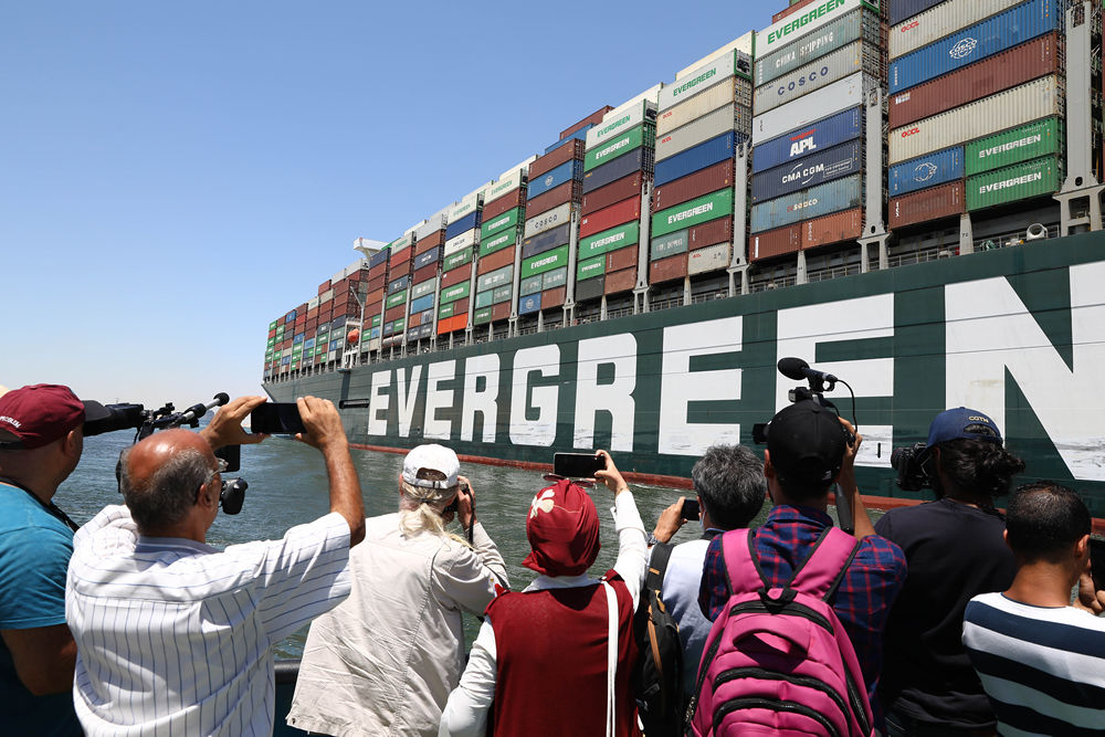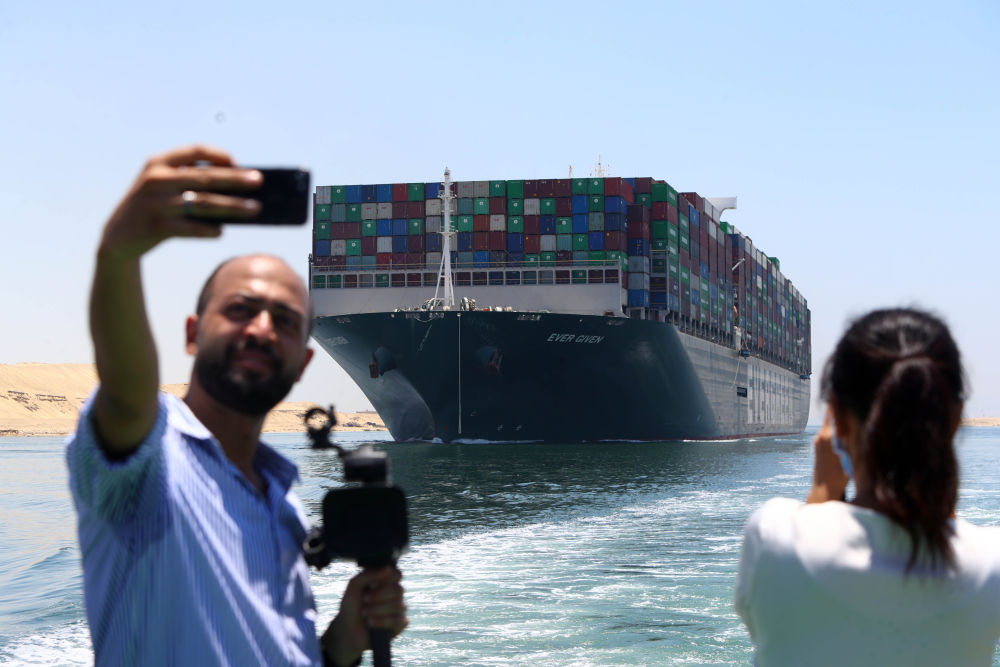 ↑7月7日,在埃及伊斯梅利亚省,人们拍摄航行在苏伊士运河上的“长赐”号货轮。