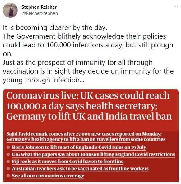 雷切尔在随后一篇帖文中指出,政府欣然承认他们的政策可能导致每天10万例感染病例,但仍在继续努力解封。正如所有人都可以通过接种疫苗获得免疫力一样,他们决定通过感染为年轻人提供免疫力……