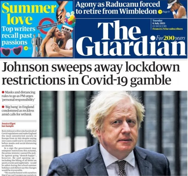 英国《卫报》的头条新闻则直接把政府的解封形容成“下赌注”。报道一针见血地指出,约翰逊在目前的疫情状况下再下赌注,将把防疫限制一扫而空。