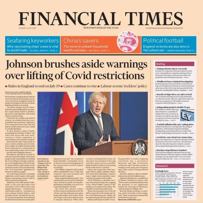 英国《金融时报》7月6日的头版标题为《约翰逊对取消防疫限制以后的警告及风险置之不理》,直接对首相展开批评。反对党工党领导人基尔·斯塔莫指责首相约翰逊对于解封的决定“过于鲁莽”,同时提及以色列“仅仅取消几天佩戴口罩的要求,就在确诊病例数激增后重新要求民众室内戴口罩”,并以此作为给政府的忠告。