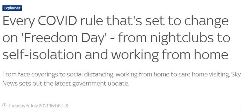 这将意味着,两周之后,英国将不再强制民众在公共场所佩戴口罩,不再要求保持社交距离,餐馆就餐、举行和参加大型活动将不再受到限制。