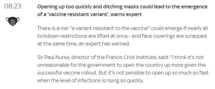 △天空新闻报道:保罗·纳尔斯爵士警告全面解封可能导致病毒进一步变异