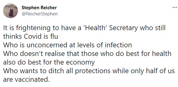 英国政府紧急情况科学咨询小组(SAGE)成员、英国行为心理学家斯蒂芬·雷切尔教授对政府不再强制要求民众戴口罩的决定表示极大担忧,并在社交媒体发布帖文质疑新任卫生大臣贾维德。
