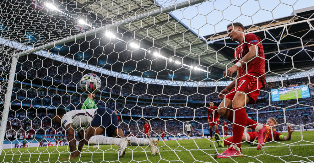 当日面对形成围攻之势的“三狮军团”,丹麦队在稳住防守的前提下偷袭成功,利用任意球直接破门力拔头筹。不过英格兰队很快在进攻中造成克亚尔乌龙,上半场即扳平比分,之后则直到加时赛才由斯特林突破创造点球机会。凯恩主罚的点球被小舒梅切尔扑出,但英格兰队长接着补射命中。