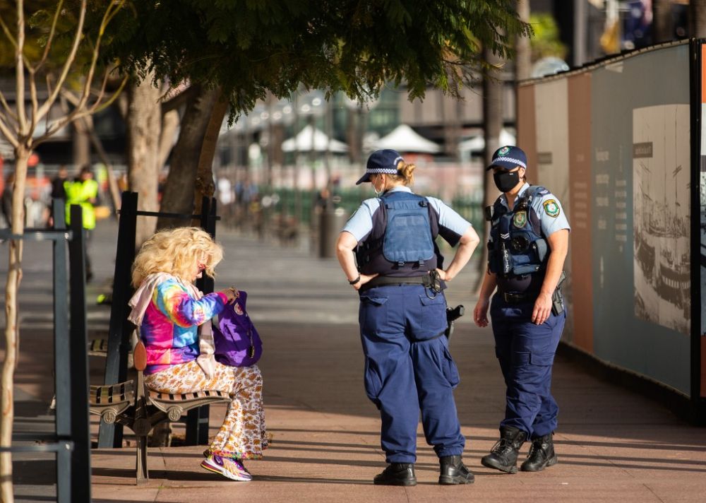 7月5日,警察在澳大利亚悉尼市中心的街道上执勤。由于本地传播病例持续出现,澳大利亚第一大城市悉尼持续保持“封城”状态。(新华社发,胡泾辰摄)