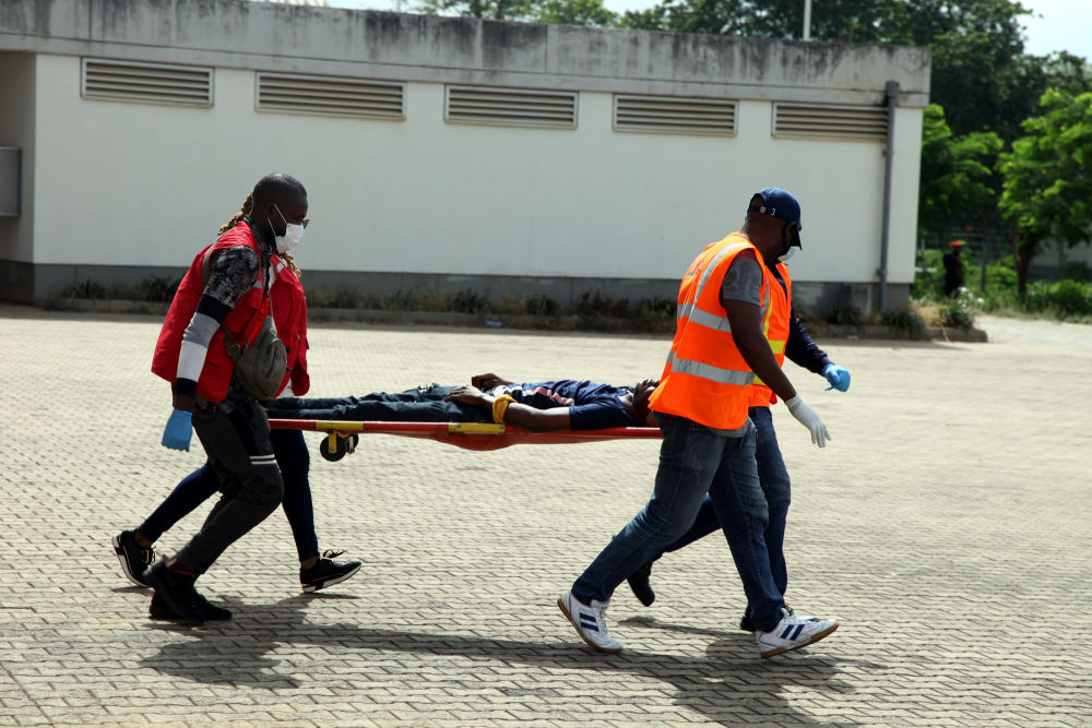 7月7日,救援人员在尼日利亚阿布贾举行的反恐演习期间模拟转移伤者。近几个月来,尼日利亚连续发生武装袭击事件,其中包括多起针对学生的绑架事件。(新华社发,彼得·奥巴摄)