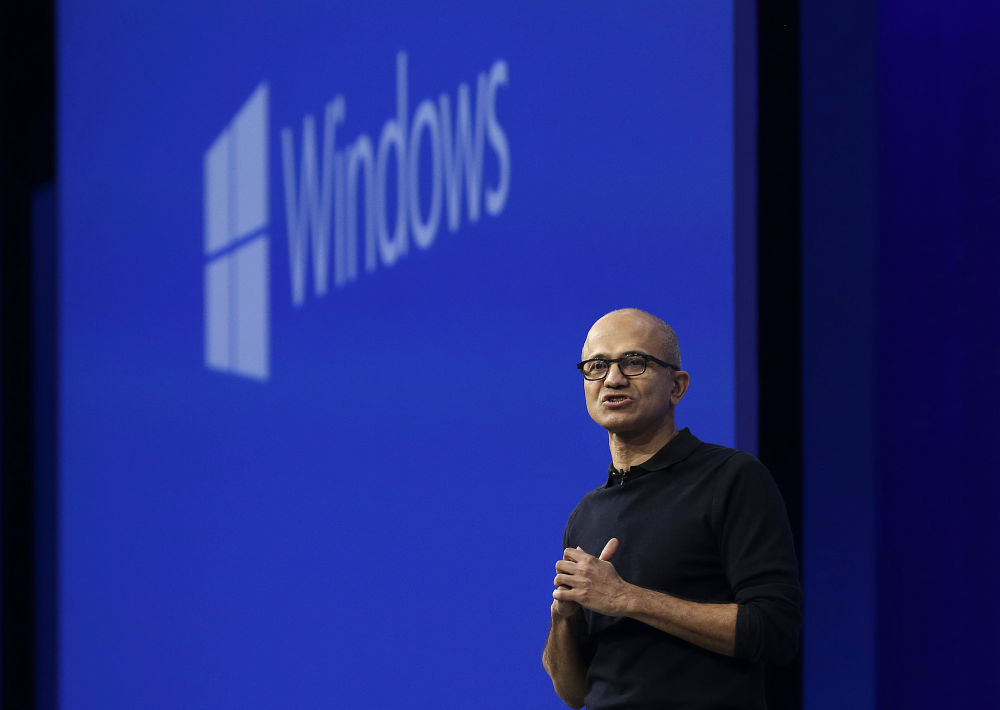 2015年4月29日,在美国旧金山,微软首席执行官萨蒂亚·纳德拉介绍“视窗10”操作系统。(新华社/美联)
