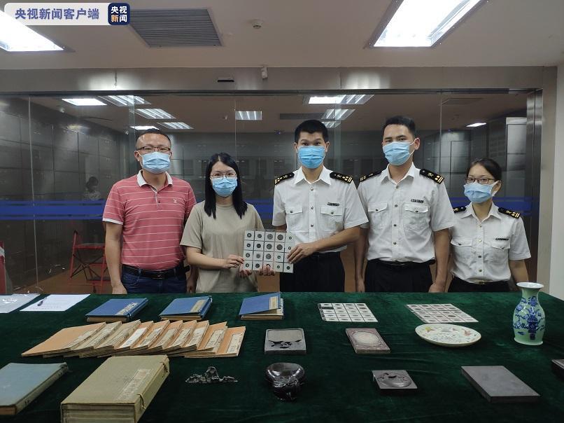 据了解,这批文物是近年来广州海关从进出境旅检、寄递渠道查获的部分走私文物,主要是清代和民国时期的文物,包括59枚古钱币、15本书画本、5件砚台、1件粉彩花碟纹盘、1件豆青青花博古纹瓶、1件笔架、1件木质盒。