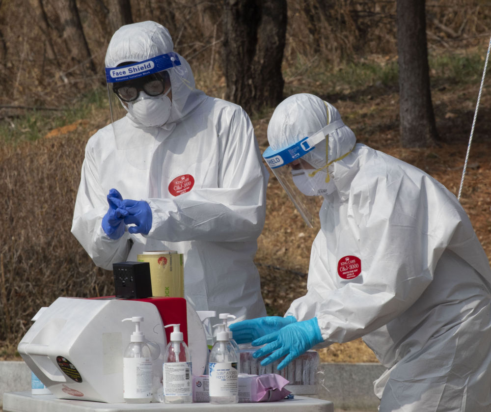 3月14日,医务人员在韩国京畿道华城市一新冠检测点准备进行检测工作。(新华社发,徐儒锡摄)