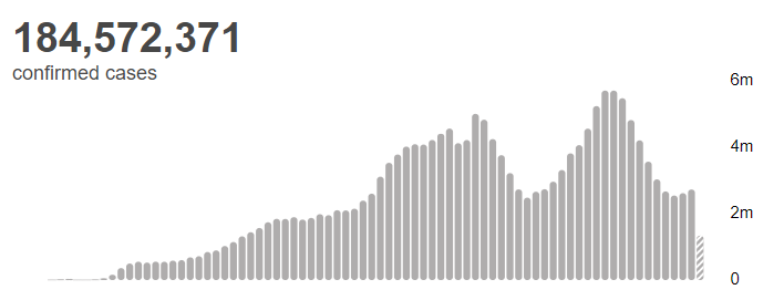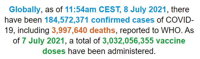 根据世卫组织最新实时统计数据,截至欧洲中部夏令时间7月8日11时54分(北京时间7月8日17时54分),全球累计新冠肺炎确诊病例184572371例,累计死亡病例3997640例。