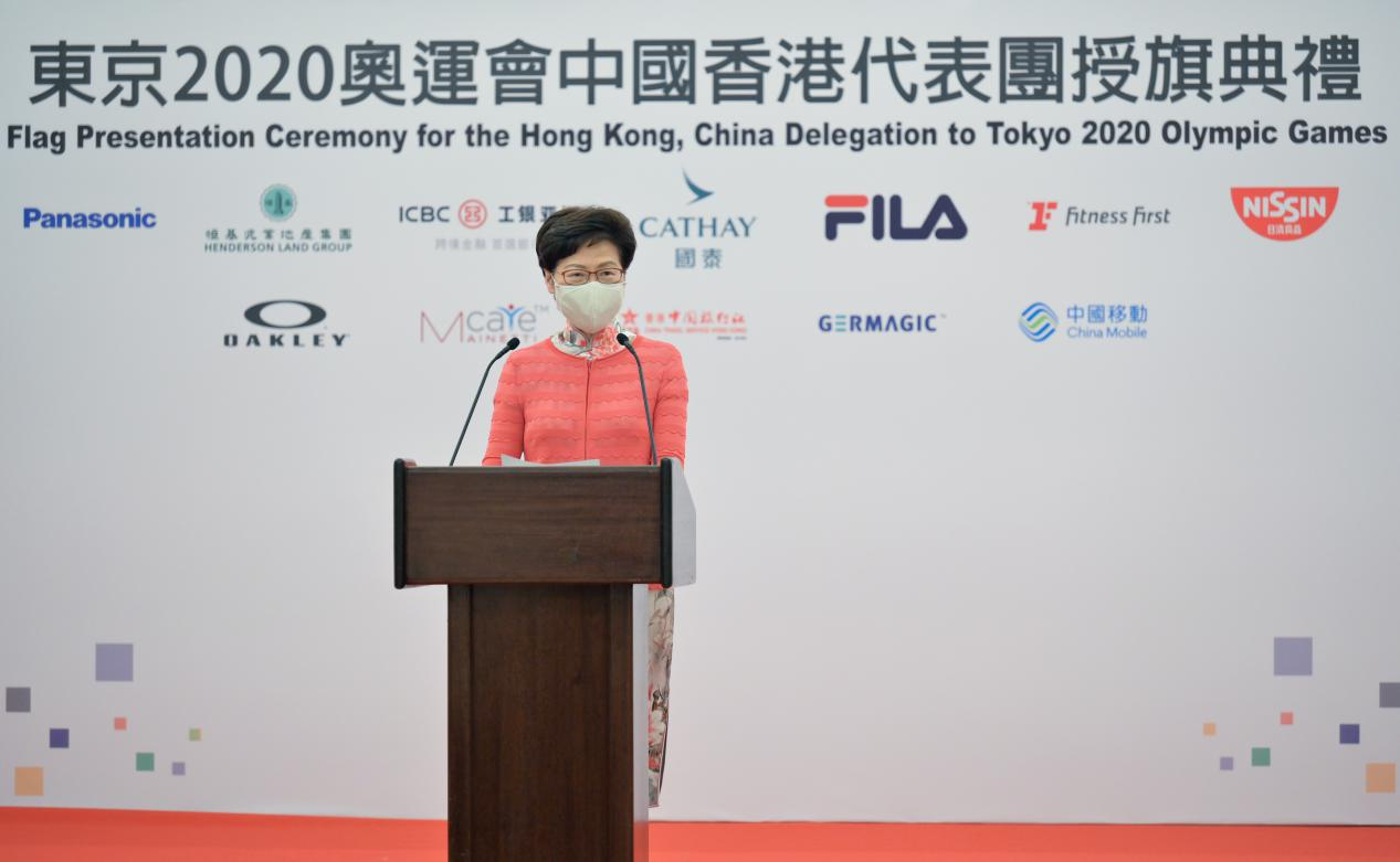 香港特区行政长官林郑月娥致辞时表示。很高兴今日能够在礼宾府举行2020年东京奥运会中国香港代表团的授旗仪式,预祝我们的奥运健儿旗开得胜,为港争光。