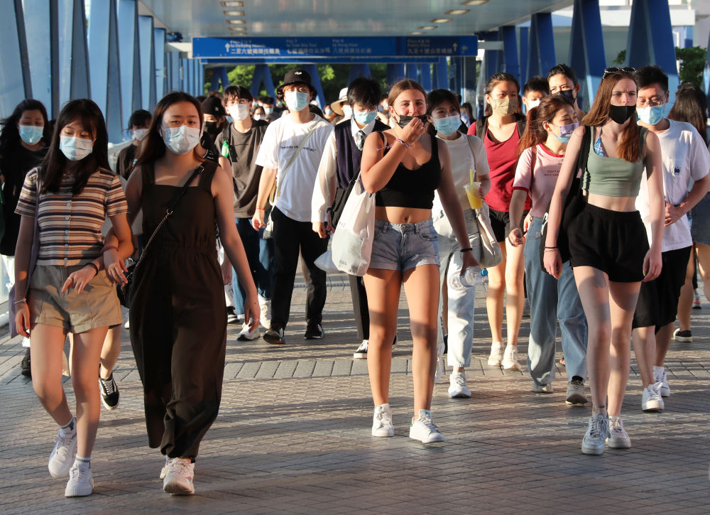 7月8日拍摄的香港中环海滨长廊上的行人。(新华社记者吴晓初摄)