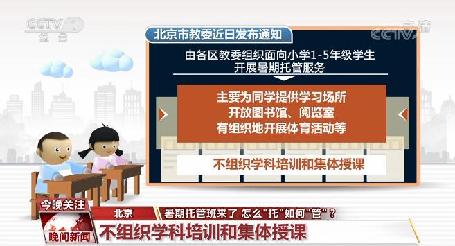 北京市教委近日发布通知,由各区教委组织面向小学1-5年级学生,开展暑期托管服务。主要为同学提供学习场所,开放图书馆、阅览室,有组织地开展体育活动等。不组织学科培训和集体授课。