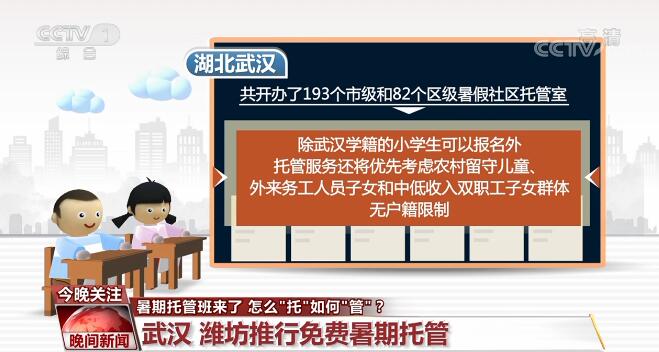 湖北武汉和山东潍坊今年都提供了免费的暑期托管服务。武汉共开办了193个市级和82个区级暑假社区托管室。除武汉学籍的小学生可以报名外,托管服务还将优先考虑农村留守儿童、外来务工人员子女和中低收入双职工子女群体,无户籍限制。