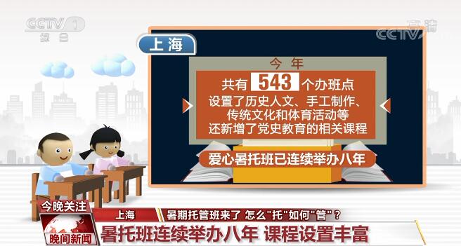 而在上海,爱心暑托班已经连续举办八年,今年共有543个办班点,设置了历史人文、手工制作、传统文化和体育活动等,还新增了党史教育的相关课程。数万名小学生将分两批参加,每期3周,按照每人每期600元收费。