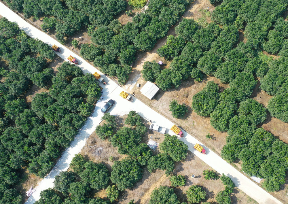 在广西罗城仫佬族自治县金玉柚生态产业扶贫示范区,装载柚子的车辆在柚子园内行驶(2019年11月5日摄,无人机照片)。(新华社记者陆波岸摄)