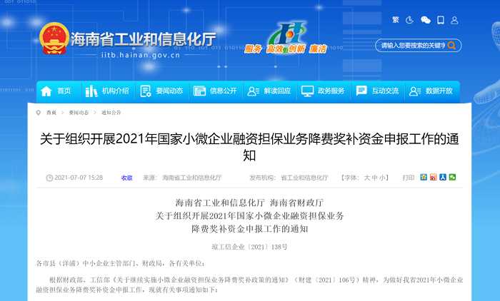 近日,海南省工信与财政部门联合印发《关于组织开展2021年国家小微企业融资担保业务降费奖补资金申报工作的通知》,明确海南各市县按照“属地管理、谁监管谁负责”的原则进行最终审核,制订具体资金使用计划,通过直接补助方式对符合条件的担保机构予以补助,重点支持政策引导性强、效果较好的担保机构,特别是直接服务小微企业且取费较低的担保机构。