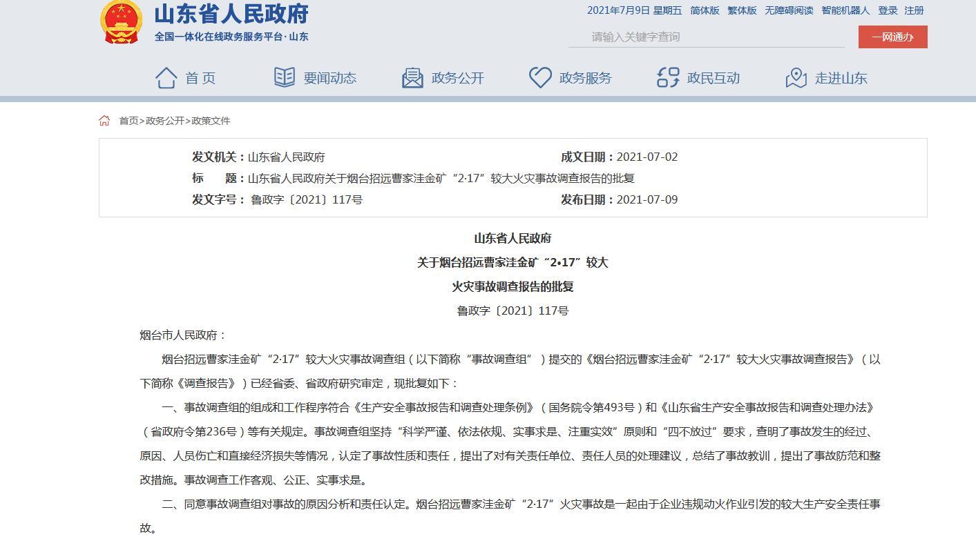 7月9日,山东省人民政府发布关于烟台招远曹家洼金矿“2·17”较大火灾事故调查报告的批复。