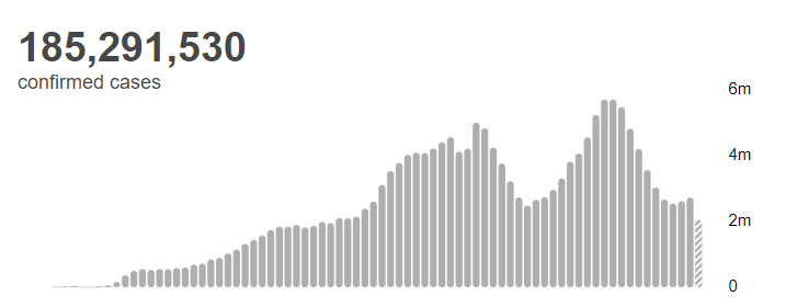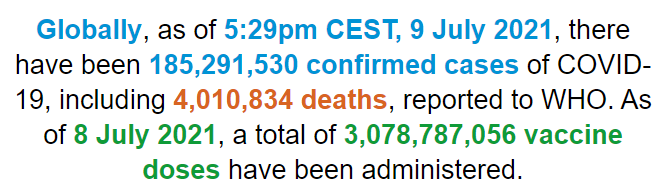 根据世卫组织最新实时统计数据,截至欧洲中部夏令时间7月9日17时29分(北京时间7月9日23时29分),全球累计新冠肺炎确诊病例185291530例,累计死亡病例4010834例。9日全球新增新冠肺炎确诊病例458355例,新增死亡病例8516例。