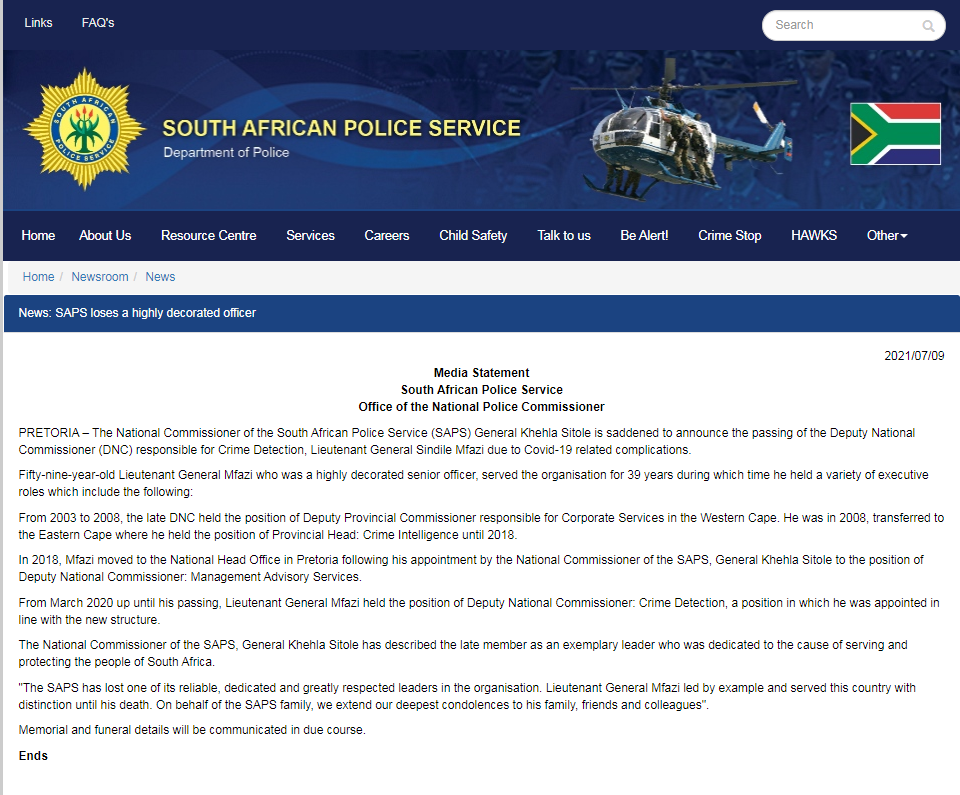 当地时间7月9日,南非警察部为7月8日因新冠肺炎去世的南非副总警监(副部长)穆法兹(Sindile Mfazi)中将举行了悼念仪式。南非警察部部长塞莱称穆法兹为致力于服务和保护南非人民的模范领导人,呼吁所有南非人为了自己,为了他人负责,要严格遵守南非防疫规定,称新冠疫情发生后南非已有超过3万名警官感染新冠肺炎,670多人去世。