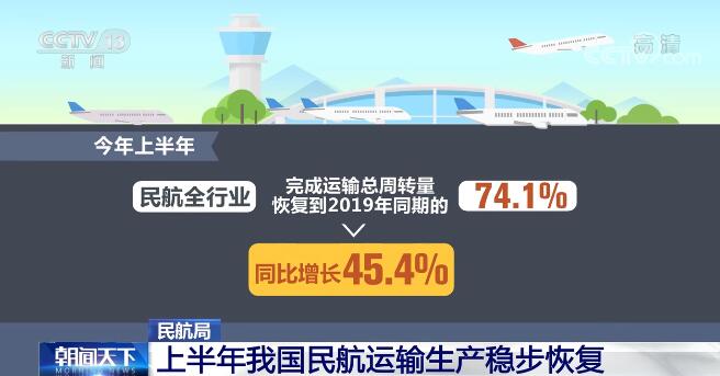 央视网消息:记者昨天(7月9日)从中国民航局了解到,今年上半年,民航全行业完成运输总周转量恢复到2019年同期的74.1%,同比增长45.4%。