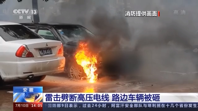 再来看另一起相似的事故。7月8日安徽滁州市定远县发生雷电活动,并伴有短时强降水。当天中午,当地发生了一起雷击劈断高压电线的意外事故,被劈断的高压电线断裂后砸中了一辆停靠在路边的轿车,直接将轿车引燃。消防人员到达现场发现,被引燃的黑色小轿车仍在雨中猛烈燃烧,而断裂在一旁的高压电线跌落在路中央,并伴有电流和火花的声音。消防员第一时间疏散现场围观人员,防止有人误伤触电,并打电话联系供电局将当前路段的电全部断掉。在确认断电后,消防员立即上前对火势进行压制。5分钟后,明火被完全熄灭。