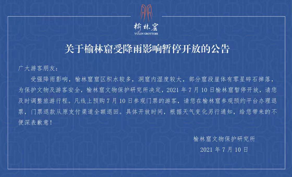为保护文物及游客安全,榆林窟文物保护研究所决定,2021年7月10日榆林窟暂停开放,请广大游客及时调整旅游行程。凡线上预购7月10日参观门票的游客,请在榆林窟参观预约平台办理退票,门票退款从原支付渠道全额退回。