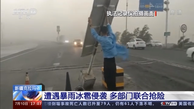 昨天(9日)晚上8点多,新疆克拉玛依市独山子区遭遇暴雨、冰雹袭击,并伴随大风、沙尘等恶劣天气,导致城区积水严重、一些广告牌和树木被大风吹倒。