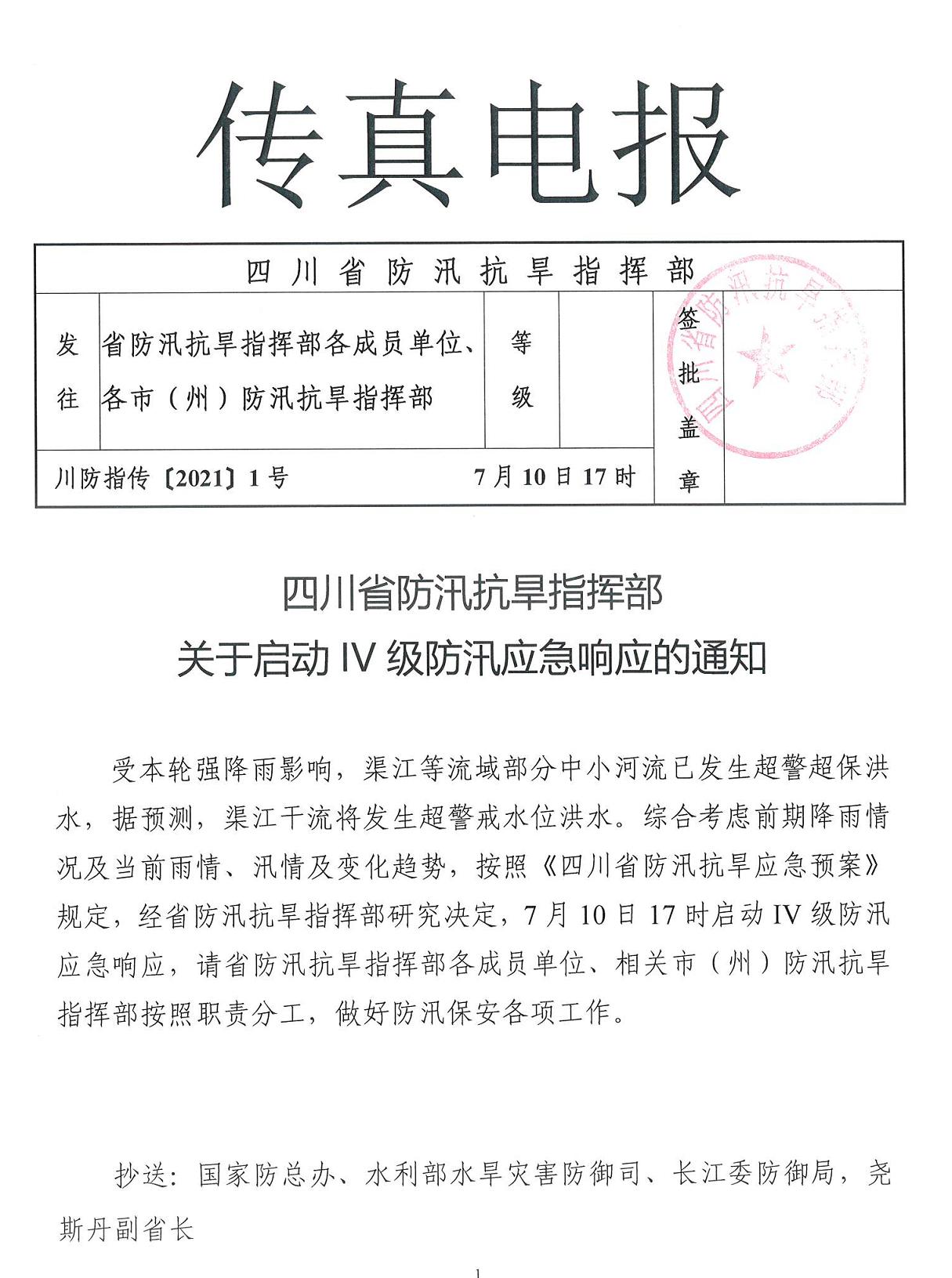 记者从四川省防汛抗旱指挥部获悉,受本轮强降雨影响,渠江等流域部分中小河流已发生超警超保洪水。据预测,渠江干流将发生超警戒水位洪水。综合考虑前期降雨情况及当前雨情、汛情及变化趋势,按照《四川省防汛抗旱应急预案》规定,经省防汛抗旱指挥部研究决定,7月10日17时启动Ⅳ级防汛应急响应,要求四川省防汛抗旱指挥部各成员单位、相关市(州)防汛抗旱指挥部按照职责分工,做好防汛保安各项工作。