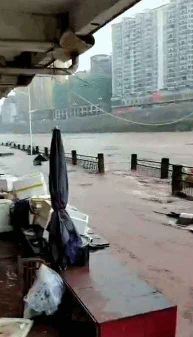 受大范围强降雨及上游来水影响,10日14时30分,在通江县城滨河路段,河里的洪水暴涨了十几米高,汹涌的洪水漫过河道,淹没了低洼路段的街道,停在马路上的汽车也被洪水完全淹没。10日17时,洪水已经淹没了县城滨河路的大部分路段。