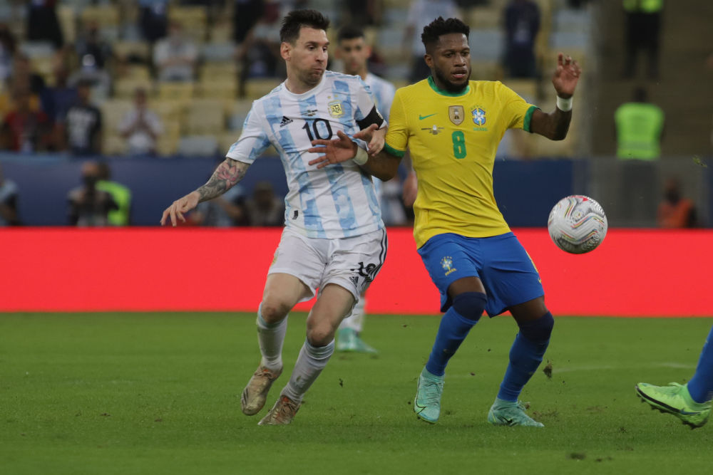 ↑阿根廷队球员梅西(左)和巴西队球员弗雷德拼抢。新华社发(拉赫尔·帕特拉索摄)
