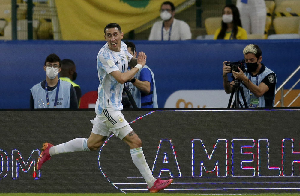 ↑阿根廷队球员迪马利亚庆祝进球。新华社发(卢西奥·塔沃拉摄)