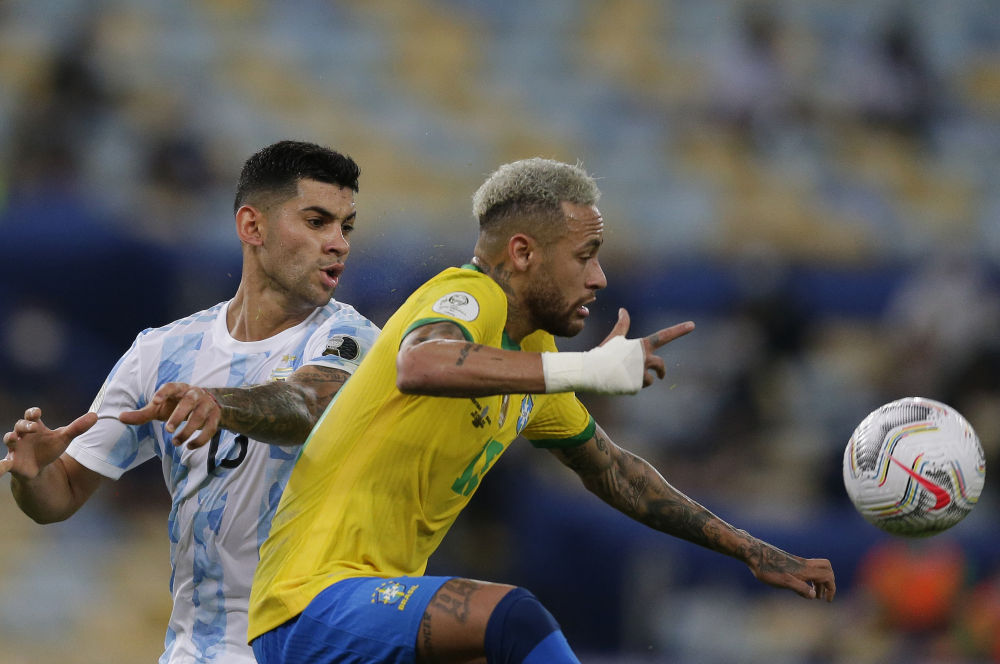 ↑巴西队球员内马尔(右)和阿根廷队球员罗梅罗拼抢。新华社发(卢西奥·塔沃拉摄)