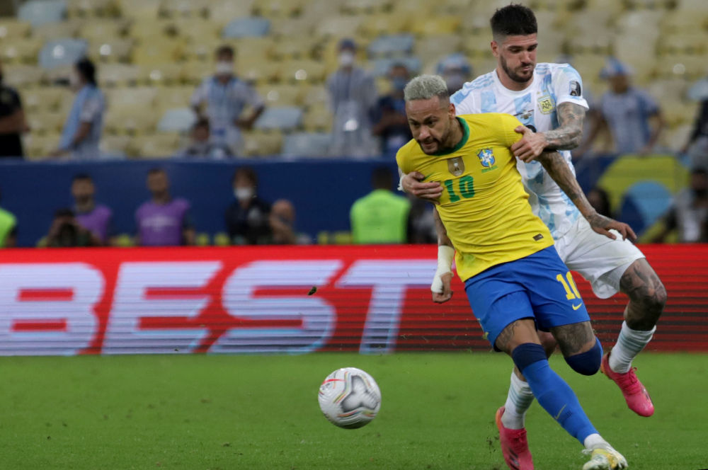 ↑巴西队球员内马尔(左)和阿根廷队球员德保罗拼抢。新华社发(拉赫尔·帕特拉索摄)