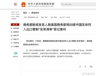 【#商务部回应美国将23家中国实体列入出口管制实体清单#】据商务部网站7月11日消息,针对美国商务部近日将23家中国实体列入出口管制“实体清单”,商务部新闻发言人11日答记者问表示,美方泛化国家安全概念,滥用出口管制措施,罔顾事实,再次以所谓“人权”等为由,将23家中国实体列入“实体清单”。这是对中国企业的无理打压,是对国际经贸规则的严重破坏,中方坚决反对。美方应立即纠正错误做法。我们将采取必要措施,坚决维护中方合法权益。(记者于佳欣)