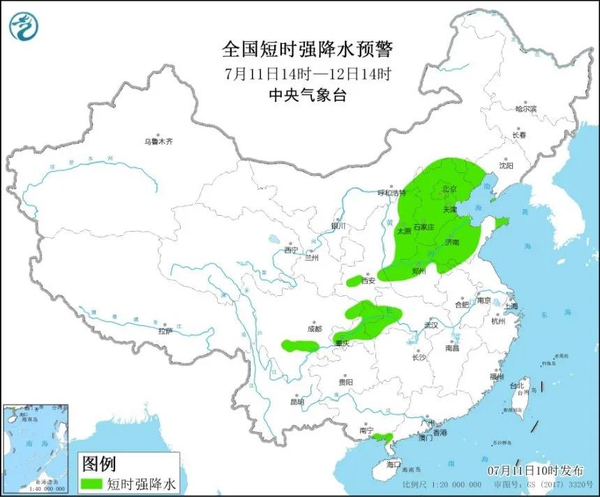 内蒙古中南部、辽宁西部、陕西中南部、山西、河北、北京、天津、山东、河南中北部、湖北西部、四川东北部和南部、重庆、广西东南部沿海等地的部分地区将有短时强降水天气,小时雨量30至60毫米,局地可达80毫米以上。预计强对流的主要影响时段为今天午后至明天。
