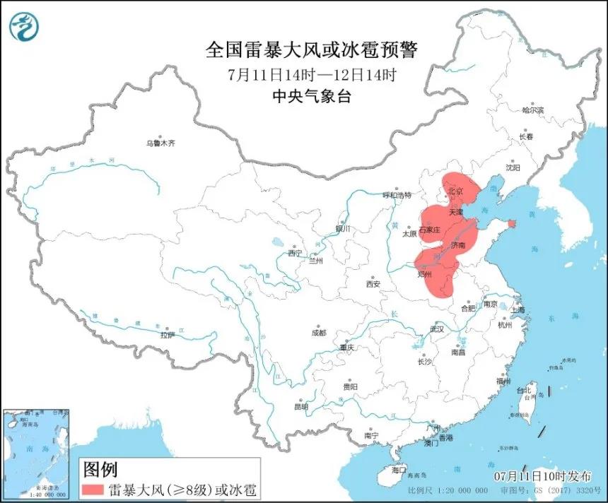 预计11日14时至12日14时,山西中东部、河北、北京、天津、山东中西部和半岛东部、河南中北部和东部等地的部分地区将有8至10级雷暴大风或冰雹天气,局地雷暴大风超过11级。