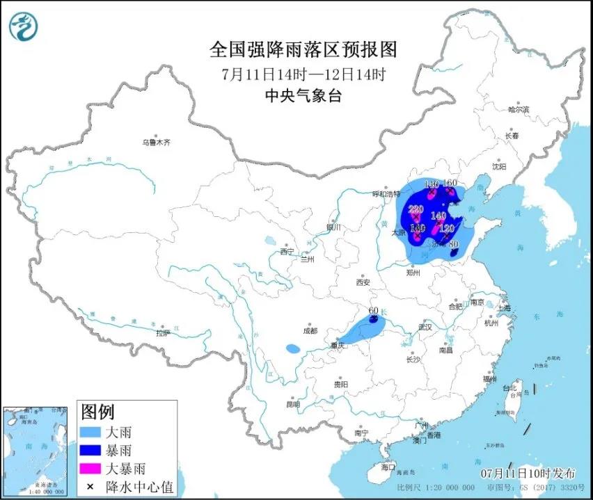 预计11日14时至12日14时,山西中东部、河北大部、山东中西部、河南北部、北京、天津等地有大到暴雨,部分地区有大暴雨(100至220毫米)。还伴有短时强降水(最大小时降雨量30至60毫米,局地可达100毫米左右)和8级左右的阵风,局地阵风可达10至11级。