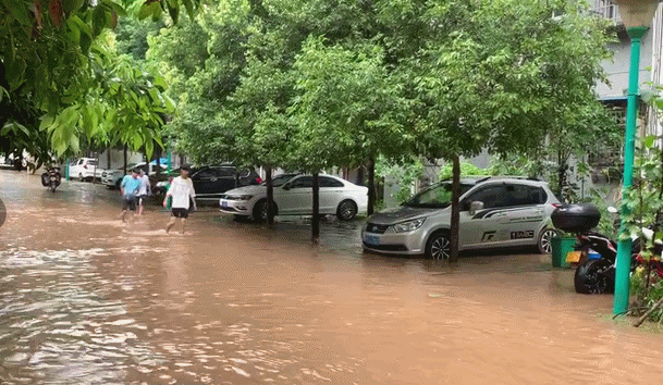 受暴雨影响,当地部分低洼地段出现大面积积水,车辆从路面经过犹如水中行船。在当地的云谷小区,短时强降雨导致小区下水道排水不畅,积水已经将小区的部分路面淹没。