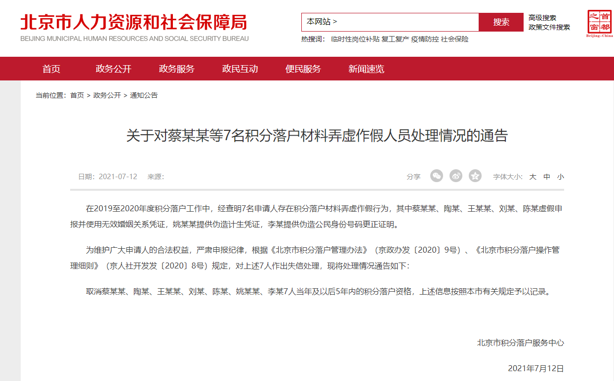 今天(12日),北京市积分落户服务中心通报,在2019至2020年度积分落户工作中,经查明7名申请人存在积分落户材料弄虚作假行为,其中蔡某某、陶某、王某某、刘某、陈某虚假申报并使用无效婚姻关系凭证,姚某某提供伪造计生凭证,李某提供伪造公民身份号码更正证明。