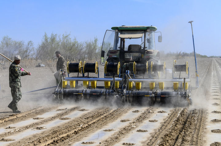 在新疆生产建设兵团第六师共青团农场的一片棉花地中,多功能一体化无人驾驶精量播种机在田间播种(2019年4月19日摄)。新华社记者 王菲 摄