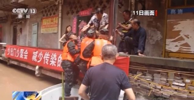 在广安华蓥市明月镇,武警官兵分成多个小组深入居民家中,挨家挨户排查,帮助群众转移财物。到11日晚7时,官兵们共转移群众100余人,物资1500余件。